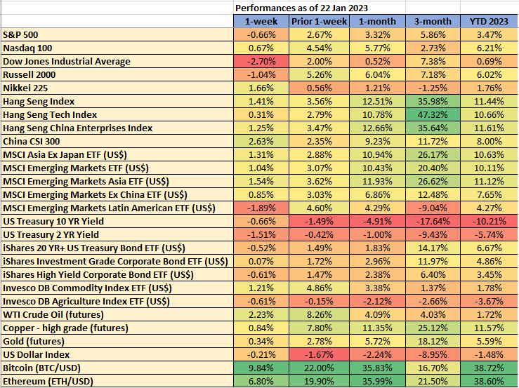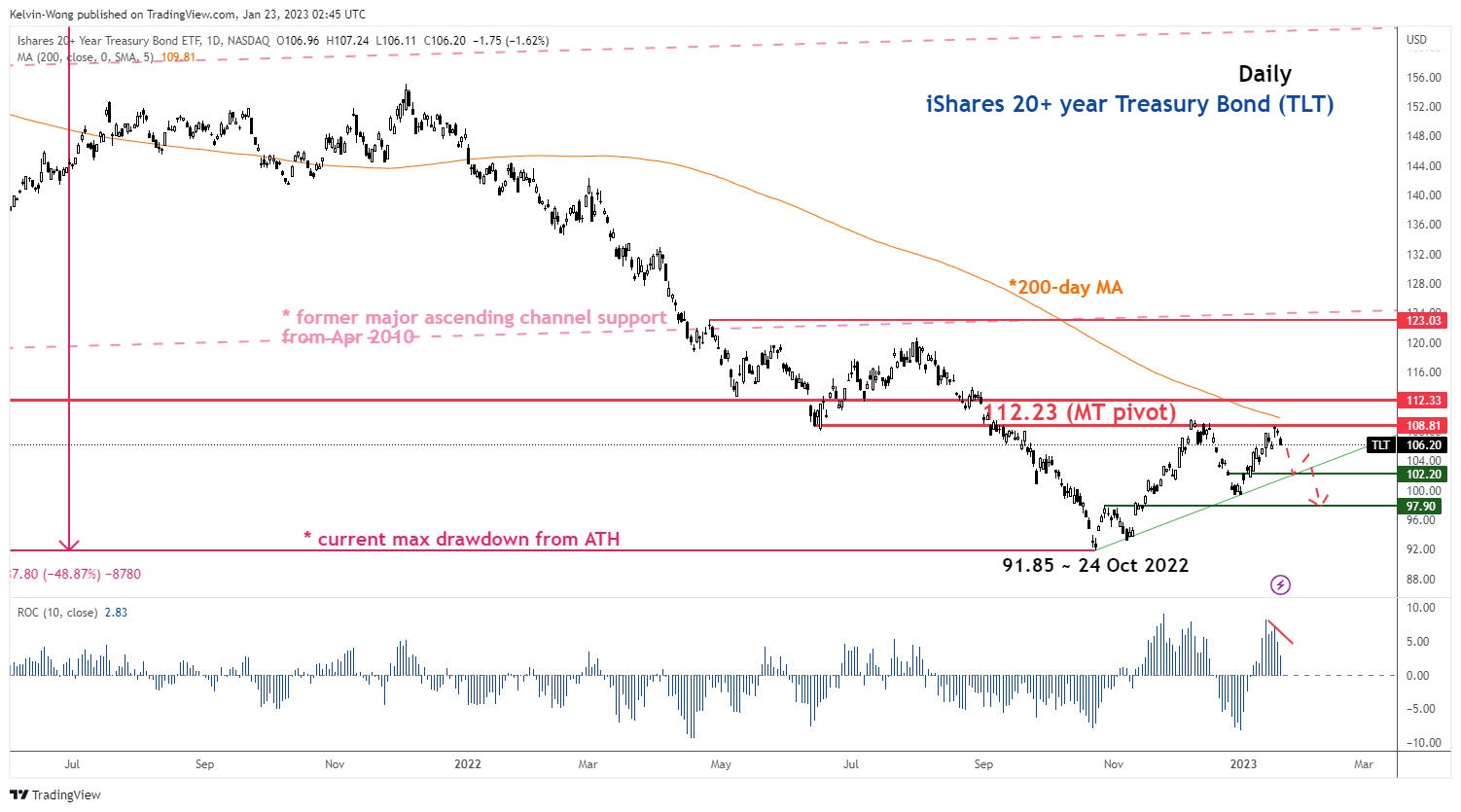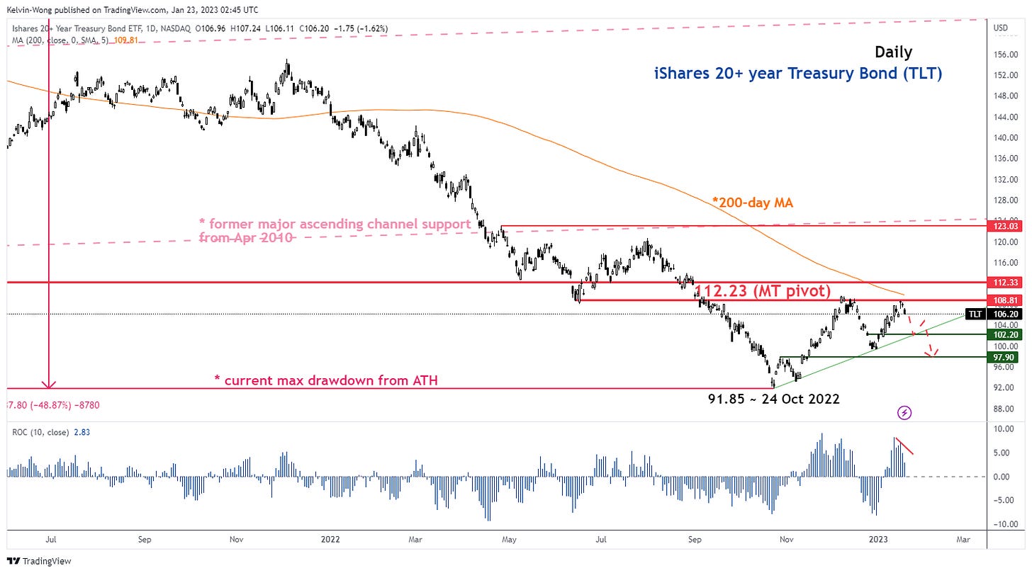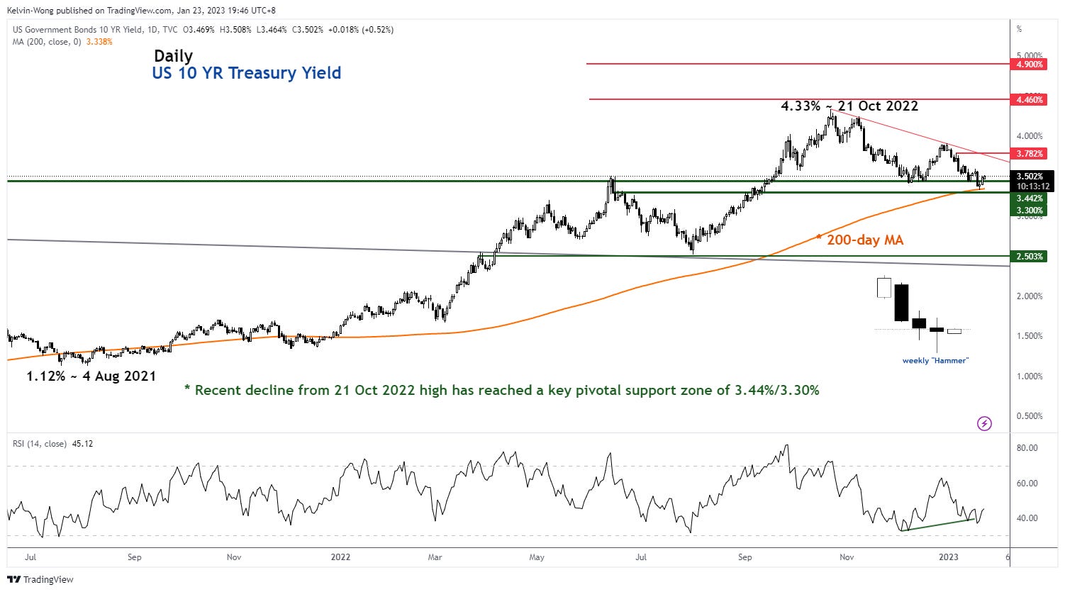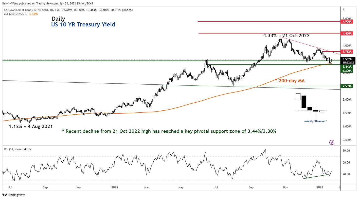 I have highlighted in my prior weekly newsletter for the week of 16 January that the downside momentum of the US Treasury yields (2-year & 10-year) has started to abate where the current bout of “risk-on fantasy” may start to face a roadblock soon. Last week, the US 10-year Treasury yield has flashed out a bullish signal; a weekly bullish “Hammer” candlestick pattern right at the predefined key pivotal support zone of 3.44%/3.30%.
