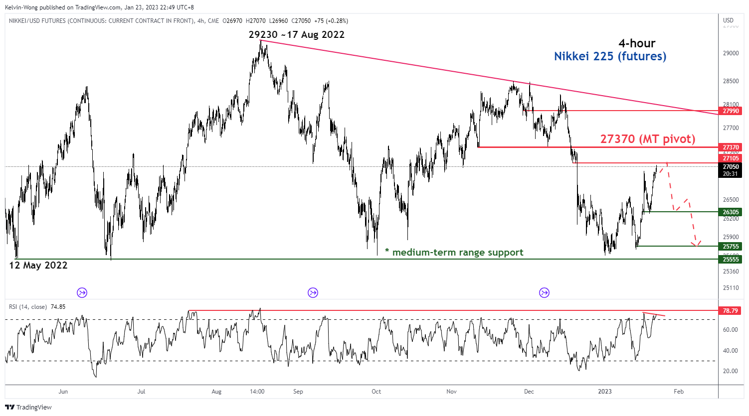 Watch the 27,370 key medium-term pivotal resistance for a potential mean reversion decline to retest the supports at 26,305 and 25,755. However, a break with a 4-hour close above 27,370 invalidates the bearish scenario for a squeeze up toward the next resistance at 27,990.