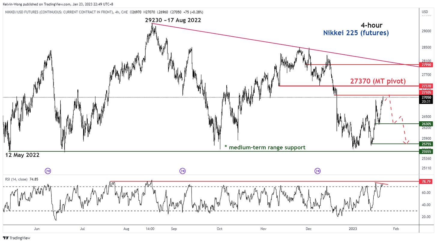 The 3-week rally of the Nikkei 225 futures within a medium-term range configuration is now showing signs of fatigue as indicated by fractals (Fibonacci retracement & extension and momentum signal (bearish divergence within an extreme overbought condition seen in the 4-hour RSI).