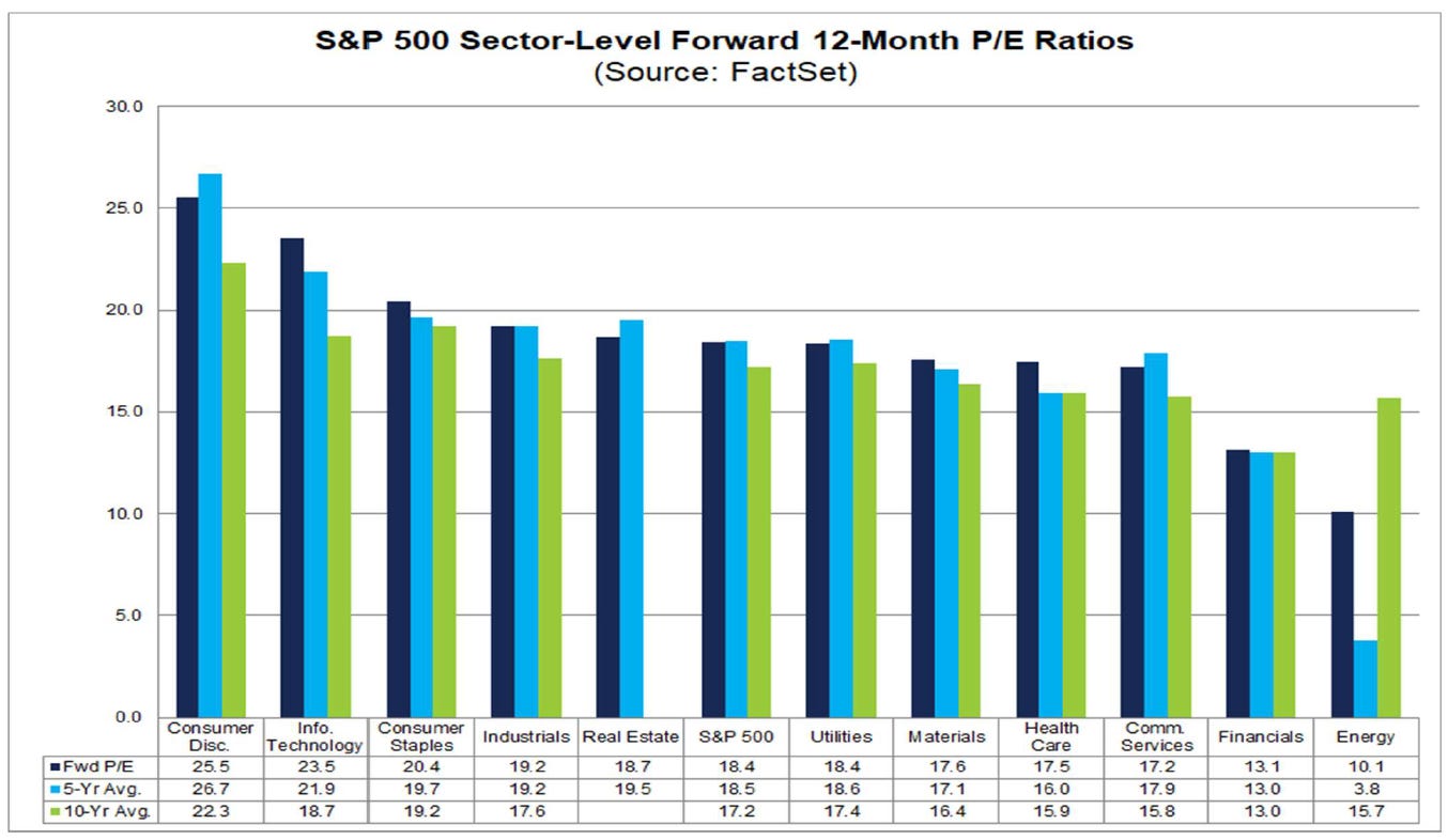 At the sector level, the forward 12-month P/E ratio of the highest weightage Information Technology (23.5) is both above its 5-year (21.9) and 10-year (18.7) averages. Also, the valuation of the Energy sector is the priciest when compared to its forward 12-month P/E ratio (10.1) versus its 5-year average of 3.8.