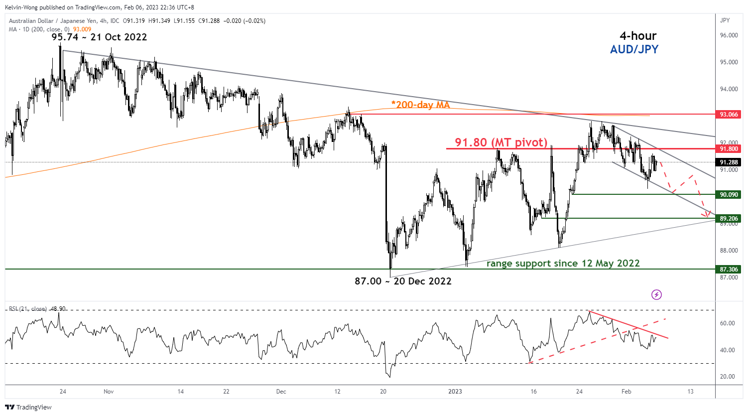 Watch the 91.80 medium-term pivotal resistance for a potential slide back down towards the lower portion of the major range configuration in place since the 12 May 2022 swing low with supports at 90.10 and 89.20. However, a clearance with a 4-hour close above 91.80 negates the bearish tone for a squeeze up towards the next resistance at 93.10 (also the 200-day moving average).