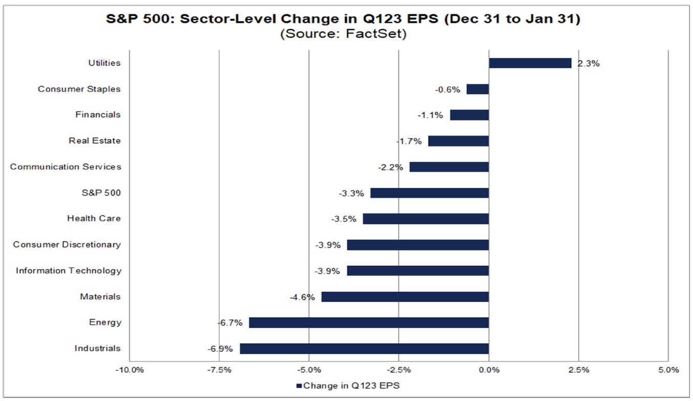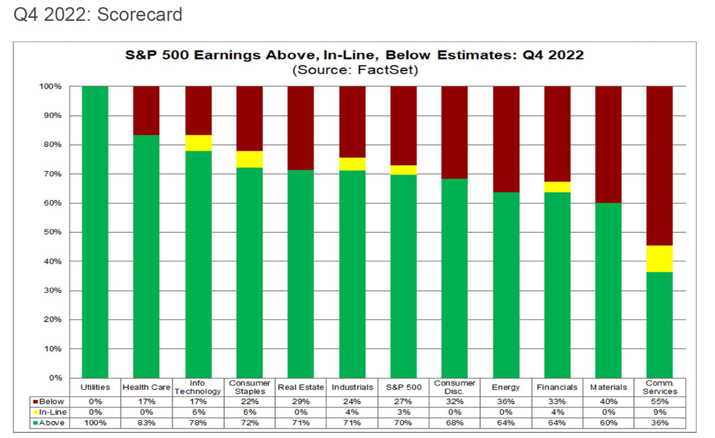 50% of the companies in the S&P 500 have reported their respective actual results for Q4 20222 to date; out of these companies, 70% have reported actual EPS above estimates which is below the 5-year average of 77% and below the 10-year average of 73%. In aggregate, companies are reporting earnings that are 0.6% above estimates, which is below the percentage of 1.5% at the end of last week, below the 5-year average of 8.6%, and below the 10-year average of 6.4%. If 0.6% is the actual surprise percentage for the quarter, it will mark the lowest surprise percentage reported by the index since 2008.