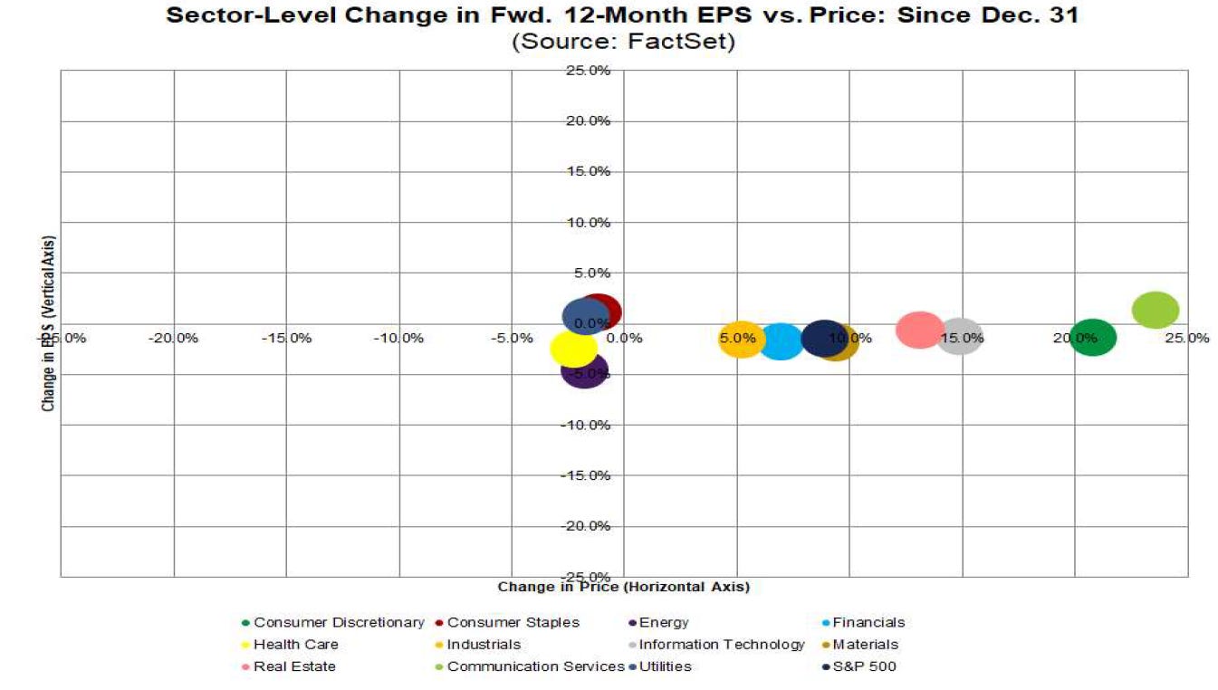 Secondly, the price returns of Communication Services (+25%) and Consumer Discretionary (+20%) since 31 December 2022 are the most “stretched” when plotted against their respective change in 12-month forward EPS numbers.