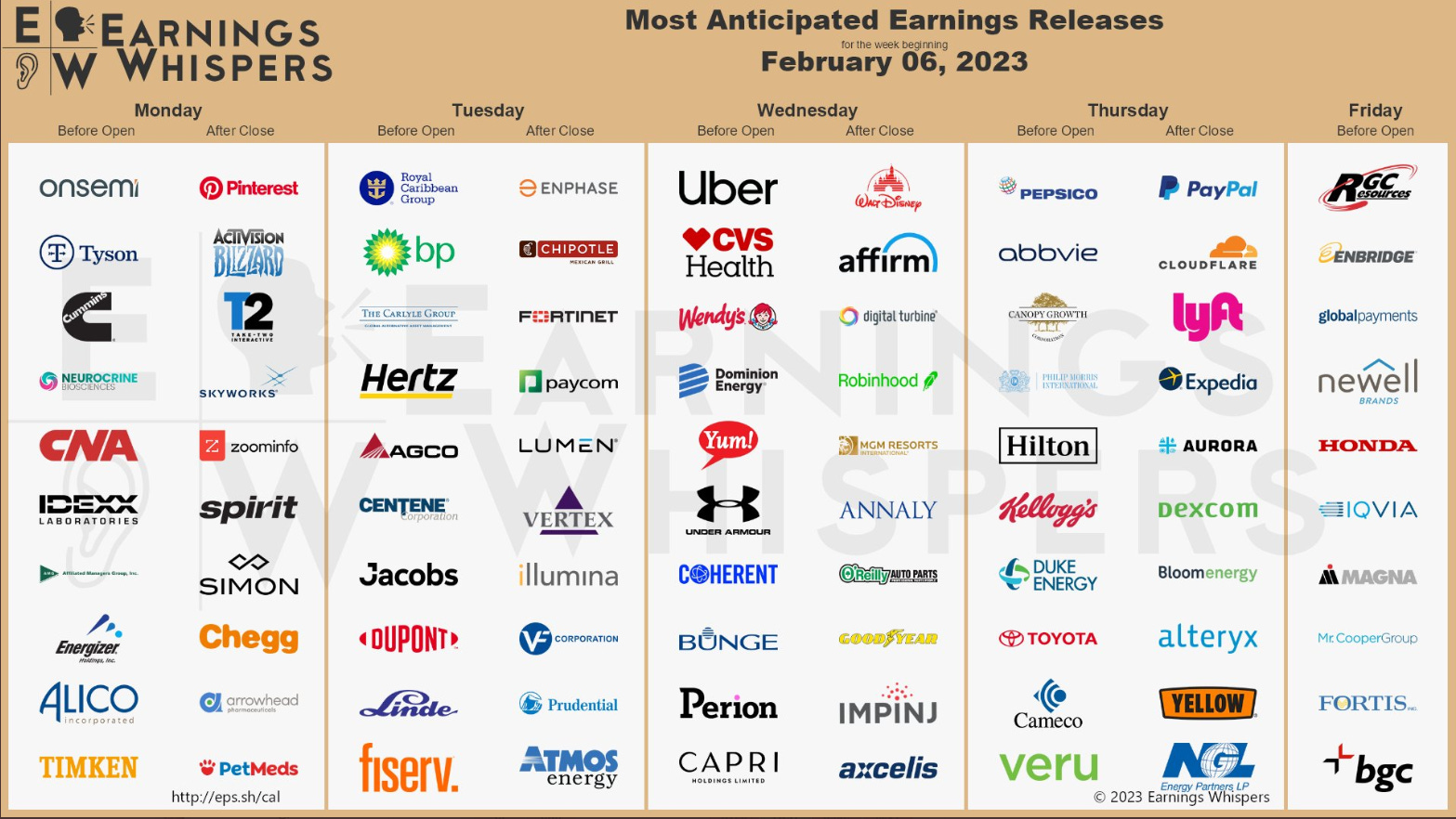 US Q4 2022 earnings season: leading firms to watch for this week will be Activision Blizzard, Uber, Walt Disney PayPal, PepsiCo, and Philip Morris International. A full table of notable reporting firms is as follows;