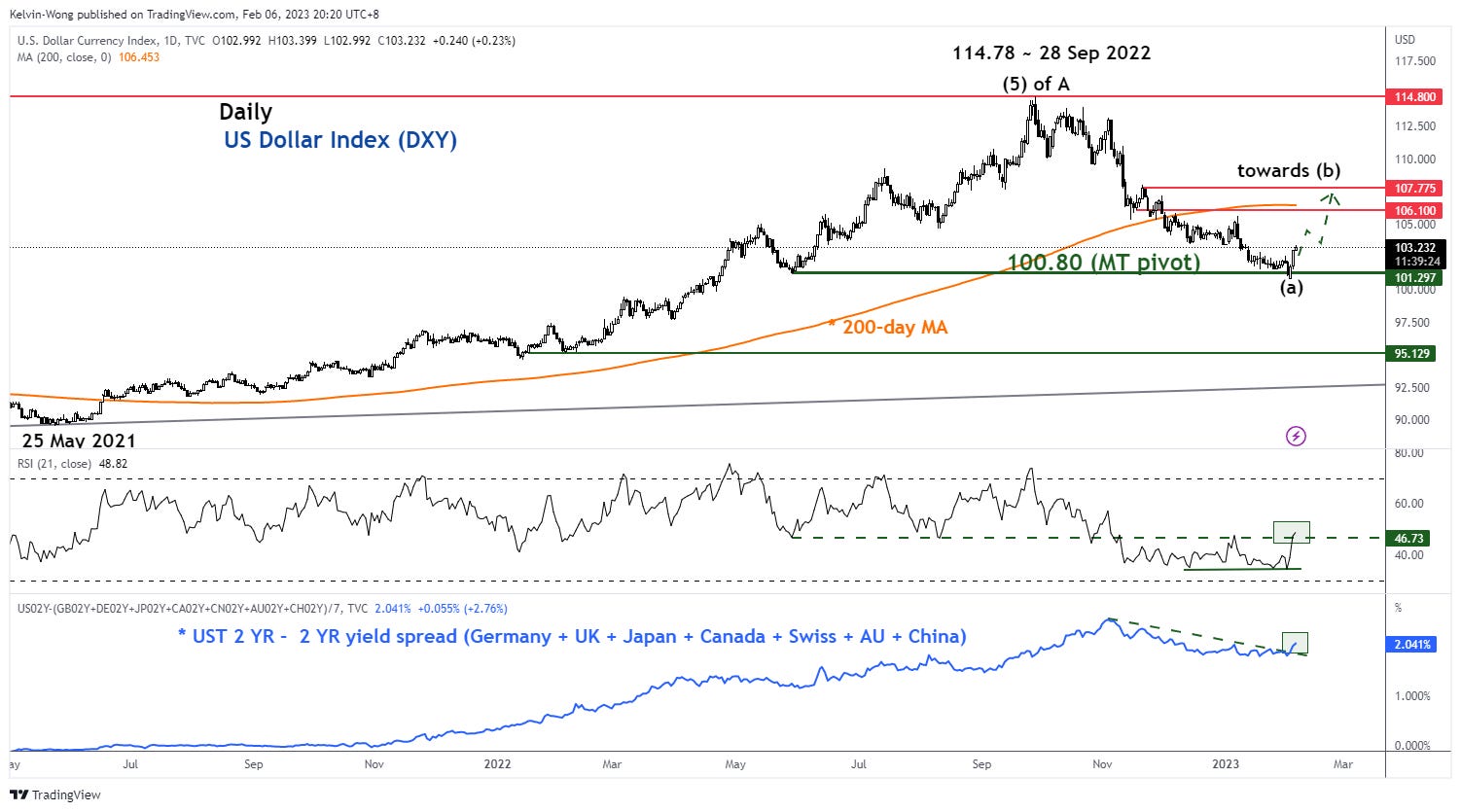 Using Intermarket and integrated technical analysis (graphical, momentum & Elliot Wave/fractals, the US Dollar Index is likely to have ended the first leg of the medium-term downtrend phase on 2 February 2023 low of 100.82. Right now, it is undergoing a potential corrective rebound to retrace the prior 4-month medium-term downtrend phase for a retest on the 106.10/107.77 resistance zone (also the 200-day moving average).
