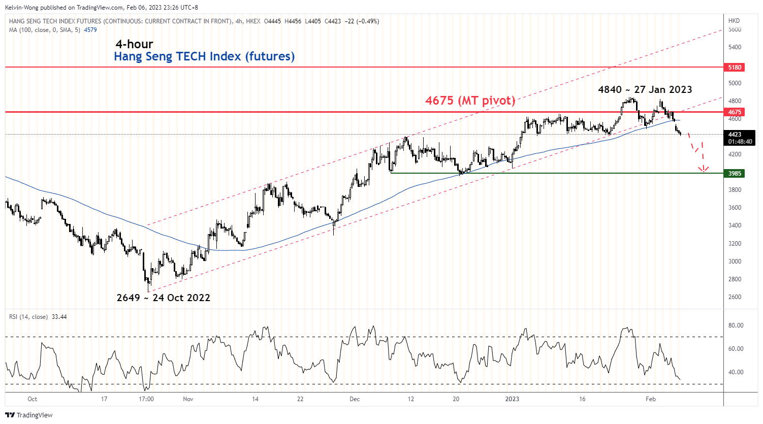 The medium-term uptrend phase of the Hang Seng TECH Index (futures) has reached its terminal level of 4,840 on 27 January 2023 via the bearish breakdown of its corresponding ascending channel support.