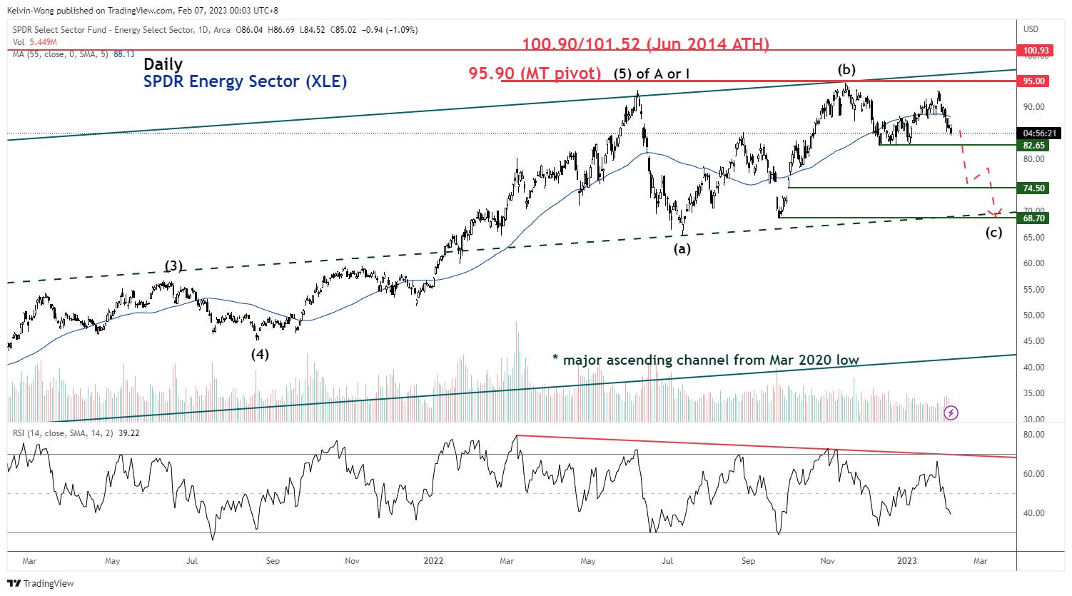 Since its 14 November 2022 high of 94.71, the technical elements of XLE have deteriorated and the odds of now skewed towards a multi-week corrective. A break below 82.65 intermediate support opens up the scope for a further potential decline toward 74.50 followed by 68.70.
